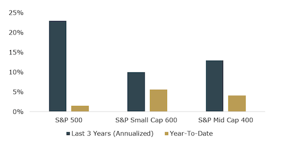 Last 3 Years Annualized and 2026 Year-To-Date Performance: S&P 500, S&P 600, and S&P 400