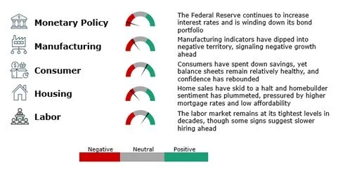 Driven by progressively tighter monetary policy, many leading economic indicators have decelerated rapidly, pointing to tougher conditions ahead for both consumers and businesses in 2023.