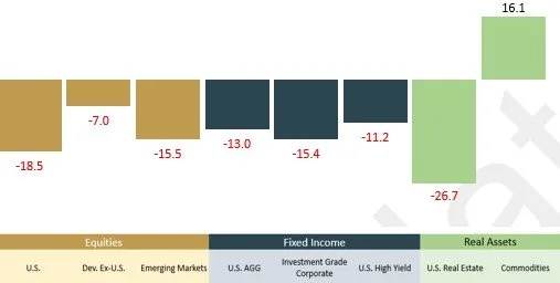 Past performance is not a reliable indicator of current or future results. Indexes are unmanaged and not subject to fees. It is not possible to invest directly in an index. Source: Kestra Investment Management with data from FactSet. Index proxies: Bloomberg U.S. AGG Bond Index, ICE BofA U.S. Corporate, ICE BofA U.S. High Yield, S&P 500, MSCI EM, MSCI EAFE, Dow Jones U.S. Select REIT, Bloomberg Commodity Index. Data as of December 30, 2022.